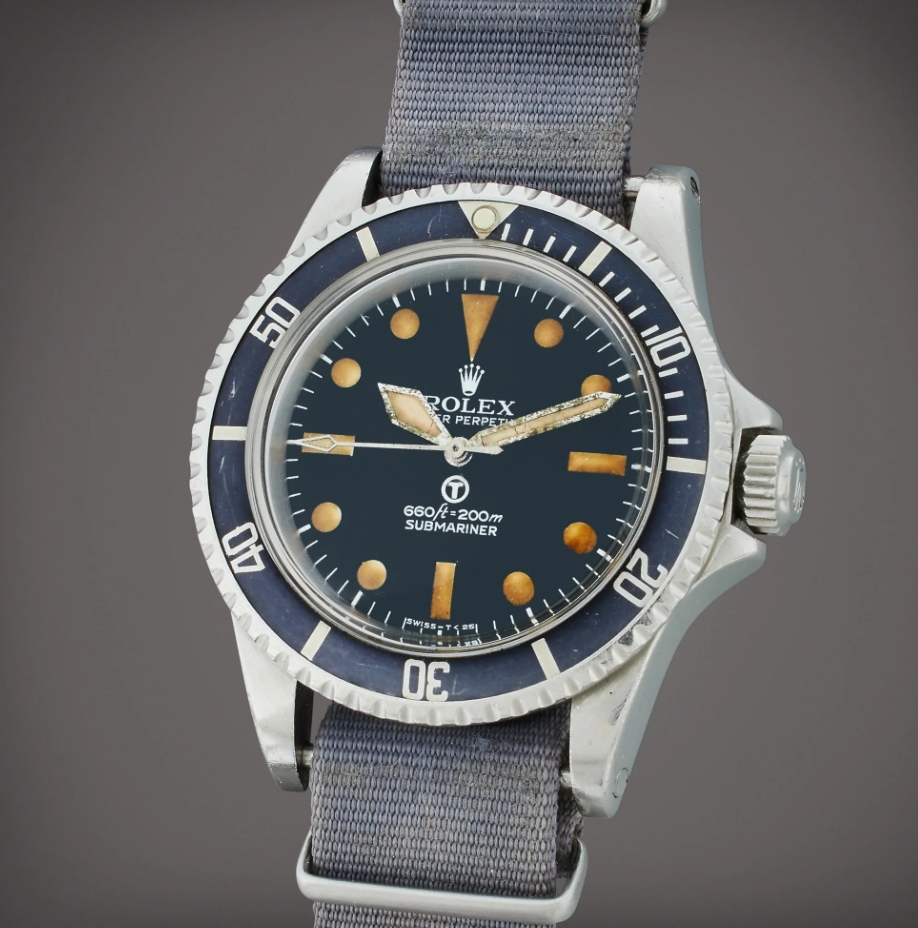 In 1972, Rolex spec’d its 5513 Submariner for Military use. These have gone on to carry the name “MilSub.” The key design characteristics of this Swiss clone Rolex watches are sword hands, an arrow tipped seconds hand, a circled “T” on the dial to signify the use of tritium, and a fully graduated bezel. Additionally, the lugs on this watch were fixed therefore meaning it could only be paired with a single-piece strap like a NATO. These MilSubs are highly coveted and were only in production for about four years.